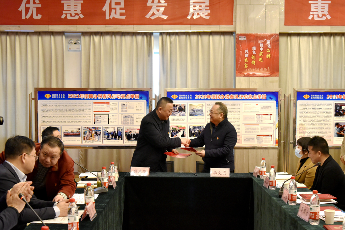 會(huì)上,市稅務(wù)局黨委書記、局長雷浩首先致辭講話,隨后市稅務(wù)局黨委委員、副局長張忠友解讀了2022年度“我為納稅人繳費(fèi)人辦實(shí)事暨便民辦稅春風(fēng)行動(dòng)”工作方案及具體措施,市稅務(wù)局納稅服務(wù)科科長楊進(jìn)宣讀了襄陽市稅務(wù)系統(tǒng)春風(fēng)行動(dòng)“十項(xiàng)承諾”;舉辦了稅企對接儀式,為10名“春風(fēng)行動(dòng)稅務(wù)體驗(yàn)師”和10名“專精特新”企業(yè)服務(wù)專員頒發(fā)了聘書;公司黨委書記李總和高新區(qū)稅務(wù)局黨委書記顧志峰共同簽訂了《稅企黨建結(jié)對共建協(xié)議書》,顧志峰書記還代表稅務(wù)部門作了表態(tài)發(fā)言;最后,舉辦了企業(yè)家代表座談,10名參會(huì)的企業(yè)家圍繞稅務(wù)部門服務(wù)質(zhì)效、便民辦稅春風(fēng)行動(dòng)和稅收宣傳月等工作建言獻(xiàn)策,提出了意見建議。