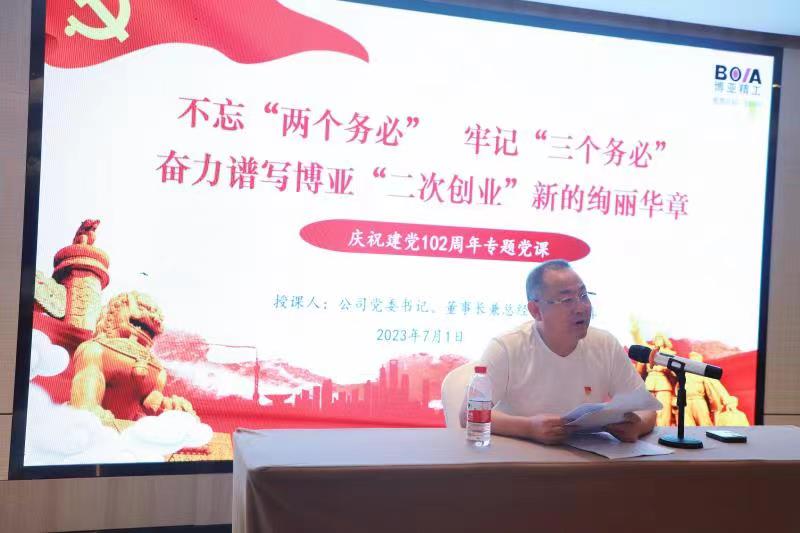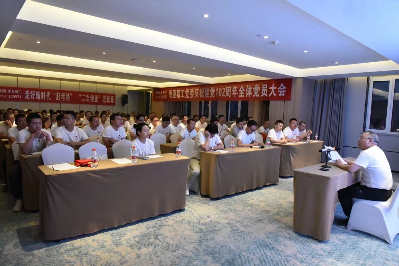 當(dāng)天晚上,在住宿酒店會(huì)議室組織召開了“慶祝建黨102周年全體黨員大會(huì)”。會(huì)議舉行了老黨員重溫入黨誓詞和預(yù)備黨員入黨宣誓儀式,黨委書記李總給預(yù)備黨員發(fā)放了《黨章》和《政治生日賀卡》。在會(huì)上表彰了公司2022—2023年度優(yōu)秀共產(chǎn)黨員,杜紅波、周微、馮攀、李波、劉軍5名同志獲此殊榮。隨后優(yōu)秀黨員代表劉軍作了表態(tài)發(fā)言,公司黨委委員輪流圍繞各自分管黨務(wù)工作談了認(rèn)識(shí)和體會(huì)。最后,黨委書記李總以《不忘“兩個(gè)務(wù)必”、牢記“三個(gè)務(wù)必”,奮力譜寫博亞“二次創(chuàng)業(yè)”新的絢麗華章,爭(zhēng)做市場(chǎng)經(jīng)濟(jì)條件下的道德模范》為題向大家講授了專題黨課。